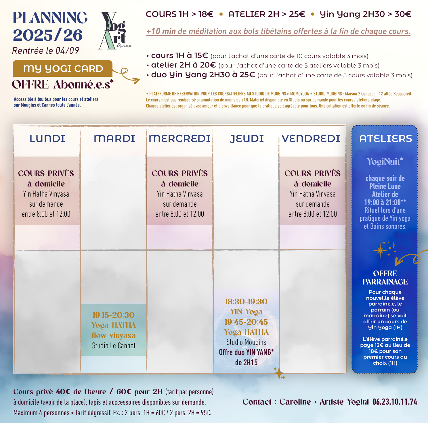 TARIFS : COURS HEBDO au STUDIO de Mougins OU À LA PLAGE •
